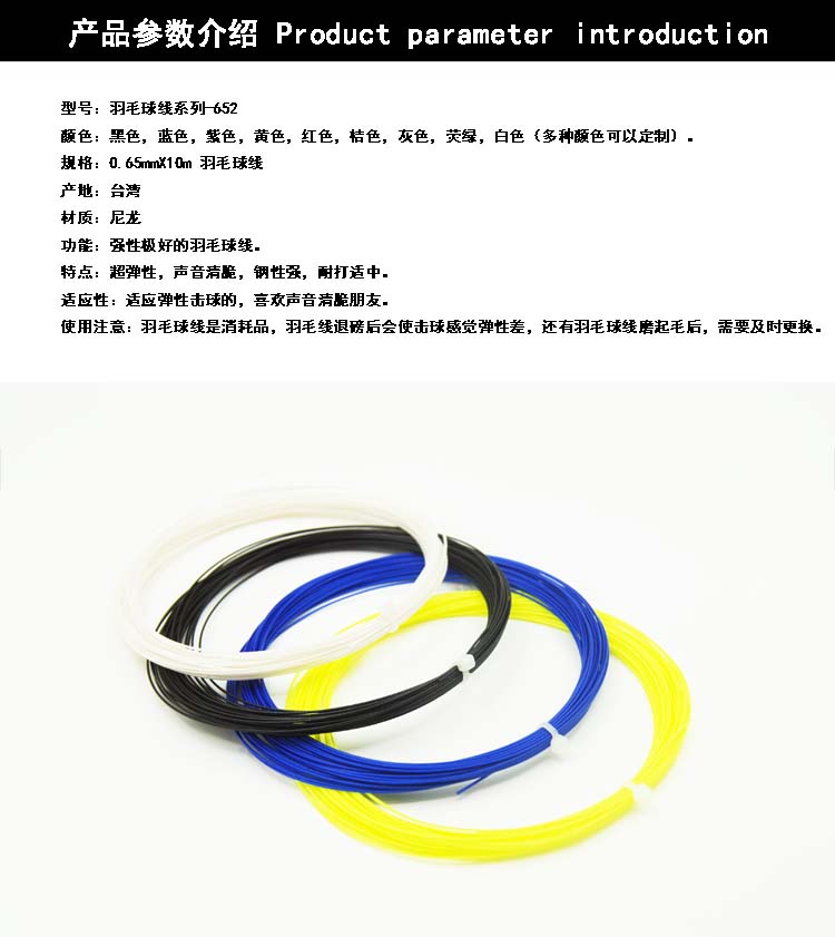 此羽線為一種特殊合成的多重細絲線。線的核心:以編帶的細線層層包裝,最外層在涂上一層特殊尼龍。0.66mm的線徑發出銳耳擊球聲音和很好的反彈力。此羽線具有優異的彈性和擊球手感。
